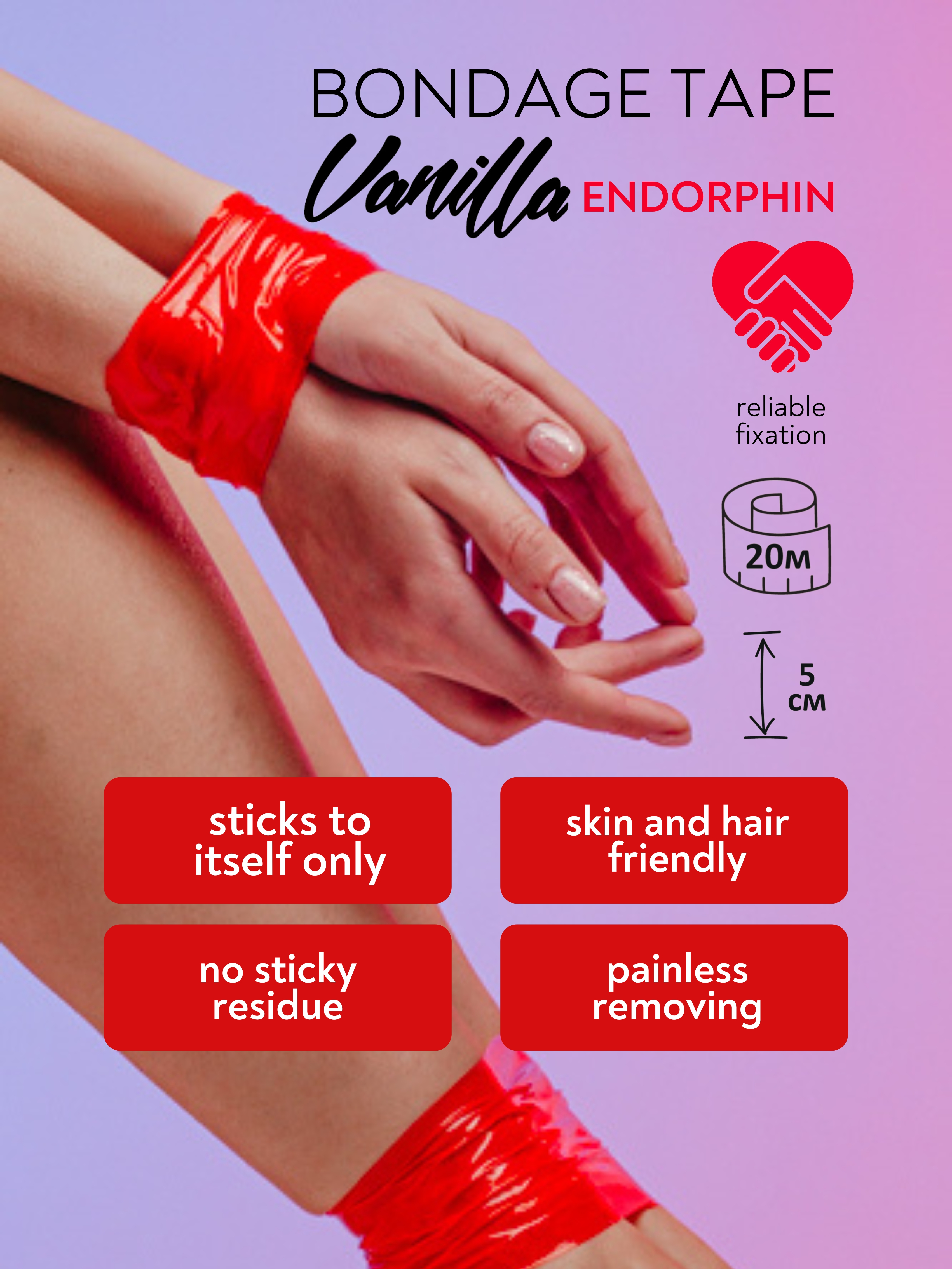 Bondage tape je navržena pro sexuální hrátky dospělých s bondage. Páska drží pouze na svém povrchu a nezanechává lepkavé stopy na těle, oblečení nebo nábytku. Bondage tape je ideální jak pro začátečníky BDSM, tak pro zkušenější uživatele. Délka pásky je 20 metrů, šířka je 5 centimetrů. Toto příslušenství pro dospělé nezpůsobuje žádné nepříjemné pocity na pokožce a nevytrhává chlupy na pažích a nohách.