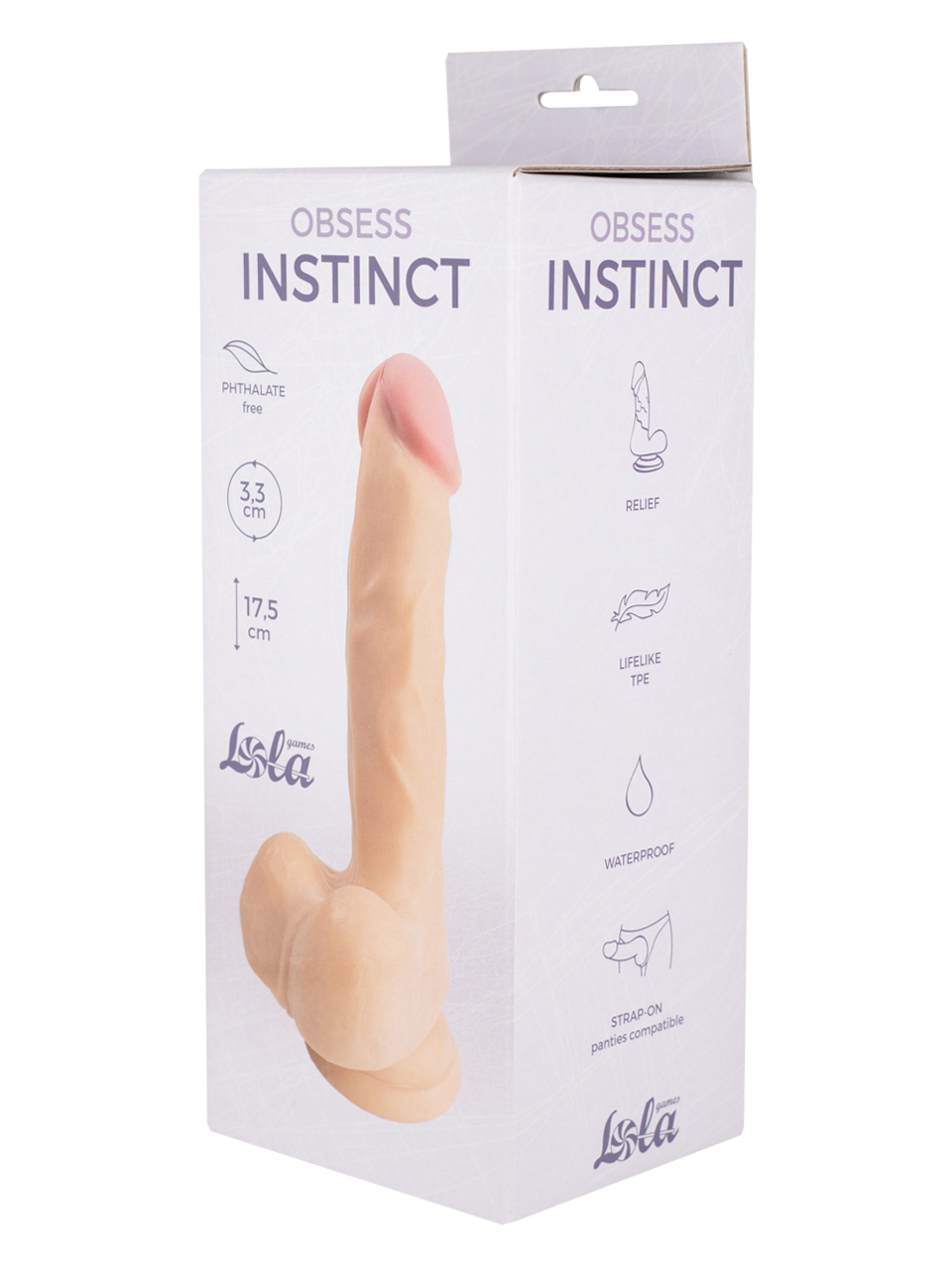 The flexible realistic Obsess Instinct dildo is made of a pleasant and incredibly soft to the touch TPE, which does not contain phthalates and is safe for the skin and mucous membrane. The dimensions of the dildo imitate the dimensions of the male genital organ close to reality, and the distinct relief in the form of the venous system and skin folds on the scrotum adds a special realism to the toy. The suction cup in the base allows you to fix the toy on any flat surface. Instinct dildos are convenient to use with panties for strap-ons.